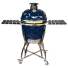The Elements Blue Diamond Kamado Grill combines durability and style with its 22-inch ceramic gemstone-patterned shell. Built with a stainless steel exterior, it features an easy-lift hinge to hold the lid open during use and a bamboo handle for a sleek and comfortable grip. This freestanding model includes a sturdy cart with folding prep surfaces, a stainless steel grill grate lifter, and a protective cover, making it a versatile and eye-catching addition to any outdoor cooking setup.